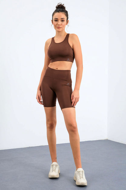 Brown High Waist Wrap-up Slim Fit Bustier Biker Women Tights Set - 95303