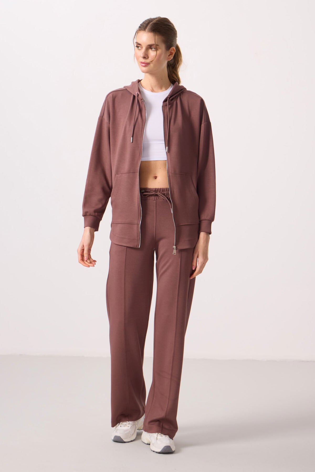 Brown Soft Textured Oversize Women's Hooded Tunic Sweatshirt - 97302
