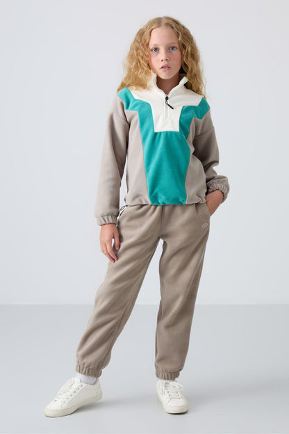 Dark Beige Thick Soft Textured Oversize Embroidered Fleece Girls' Sweatshirt - 75153