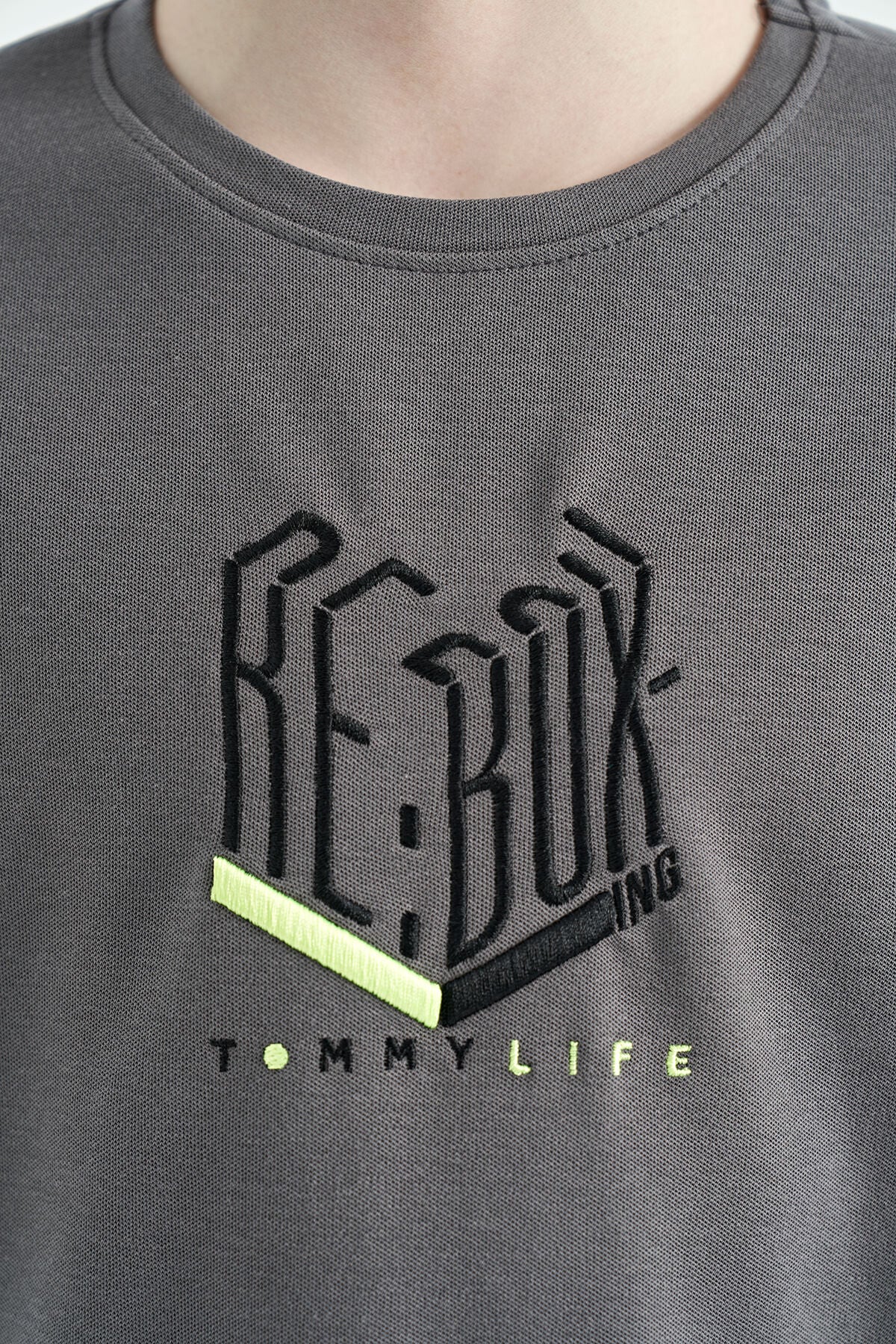 Dark Grey Embroidered O Collar Oversize Boys' T-Shirt - 11151