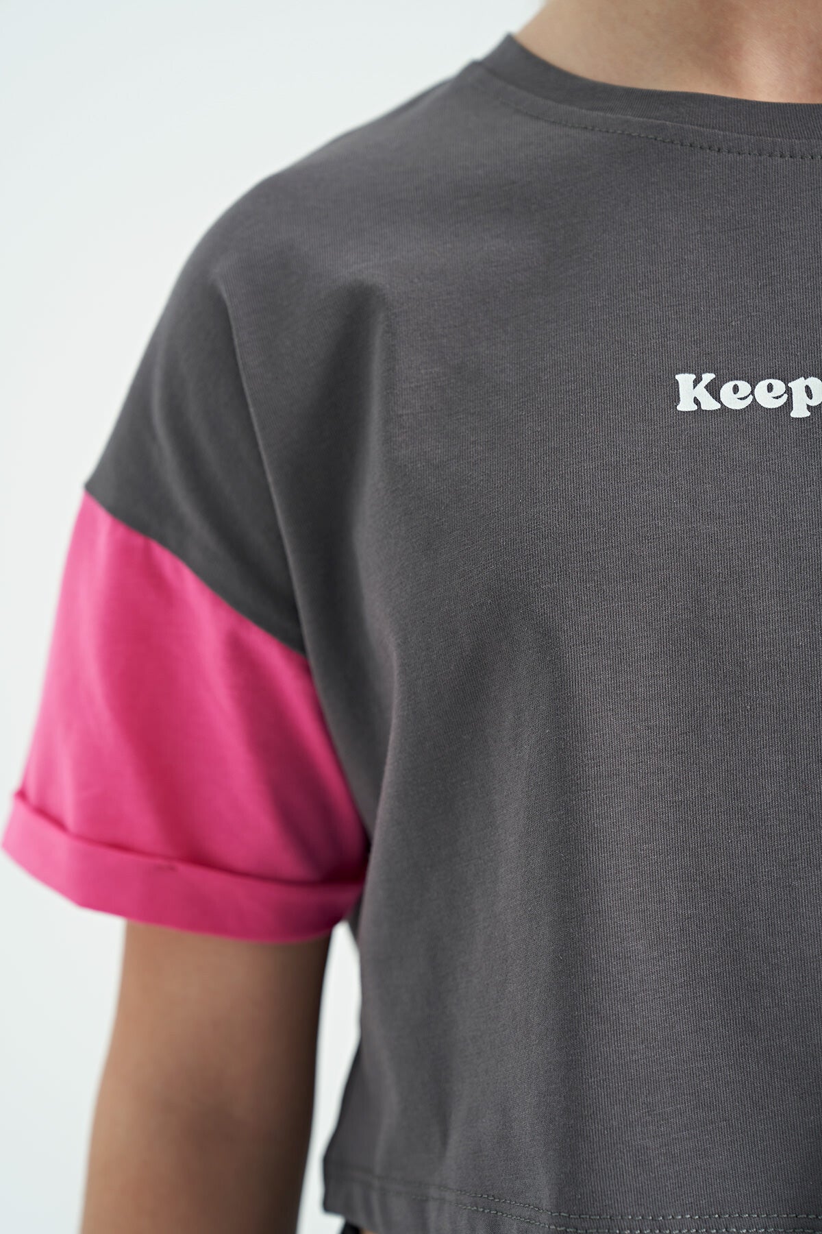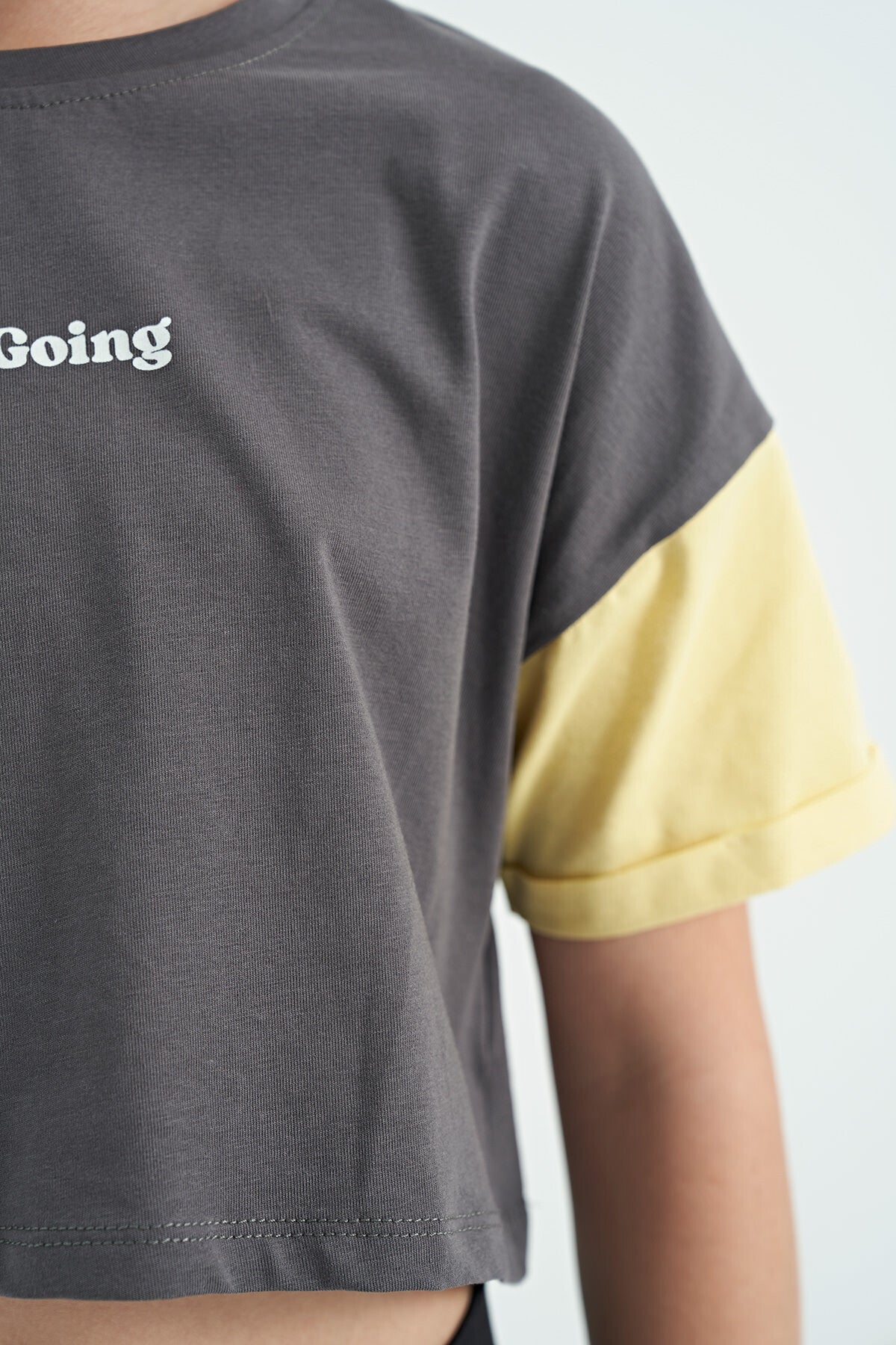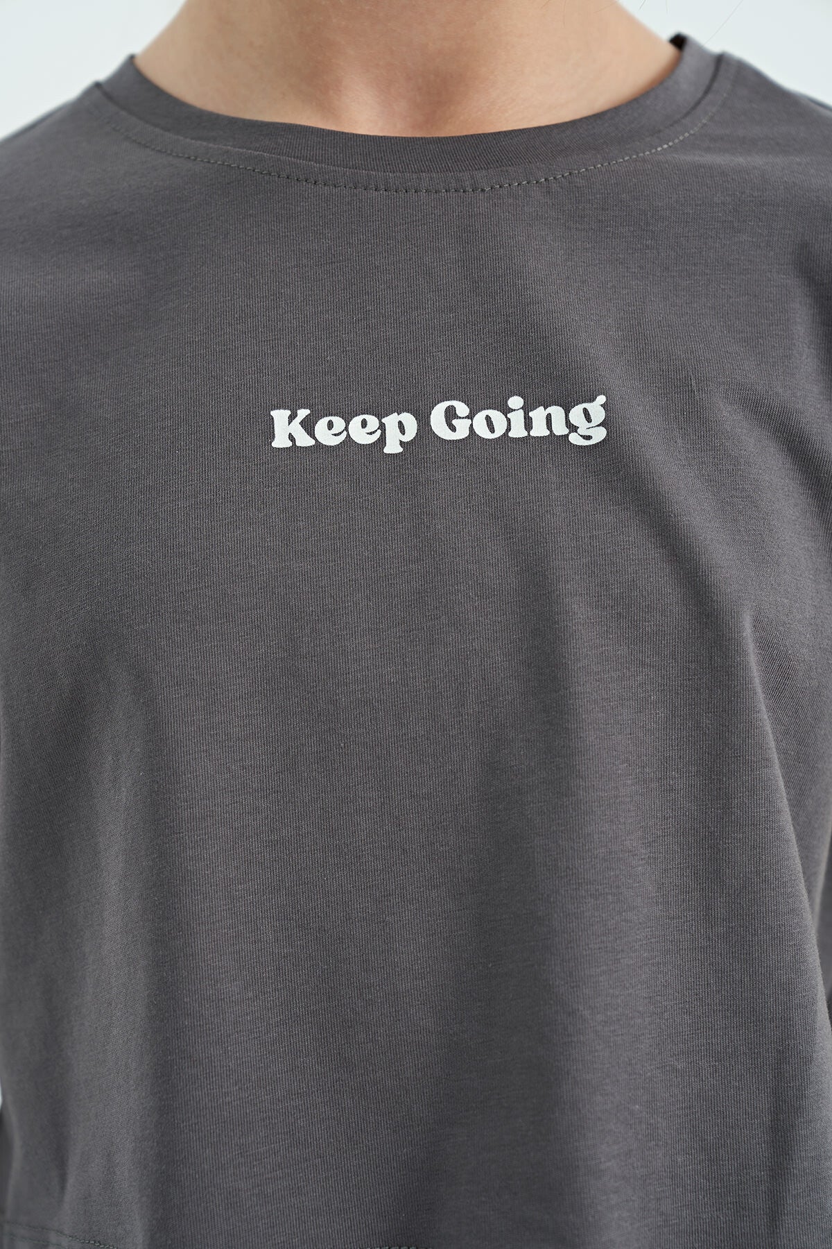 Dark Gray Print O Collar Low Shoulder Oversize Girl's T-Shirt - 75130