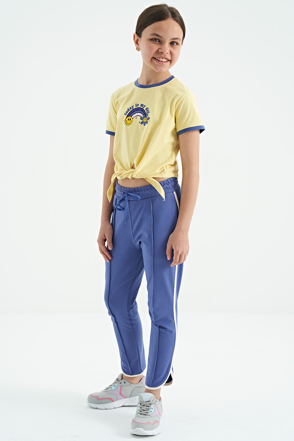 Detailed Print Yellow O-Neck Multi-Colored Tie-Detail Girl's T-Shirt - 75113