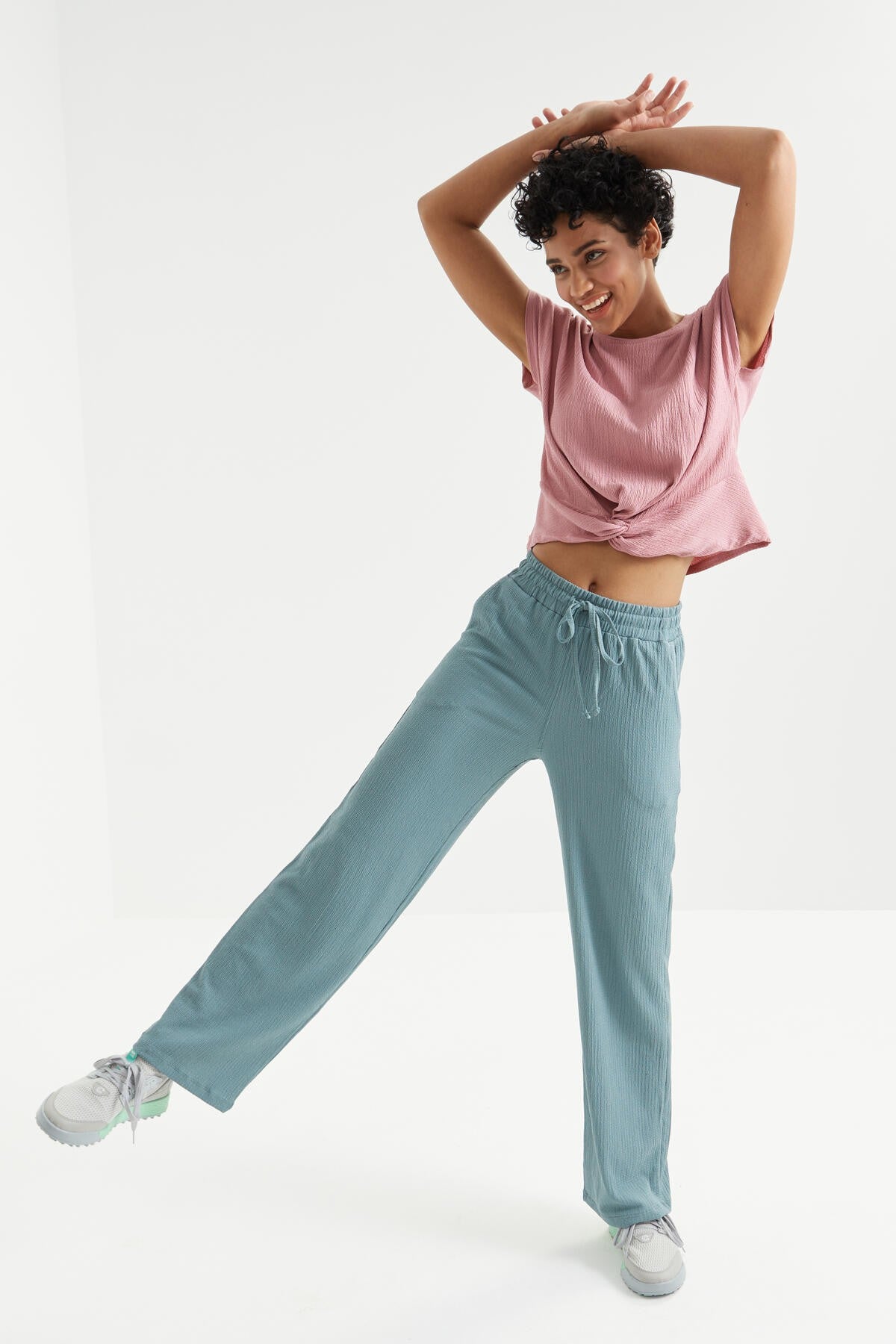 Dried Rose O Neck Front Gather Detailed Crinkle Fabric Women's Crop Top T-Shirt - 97228