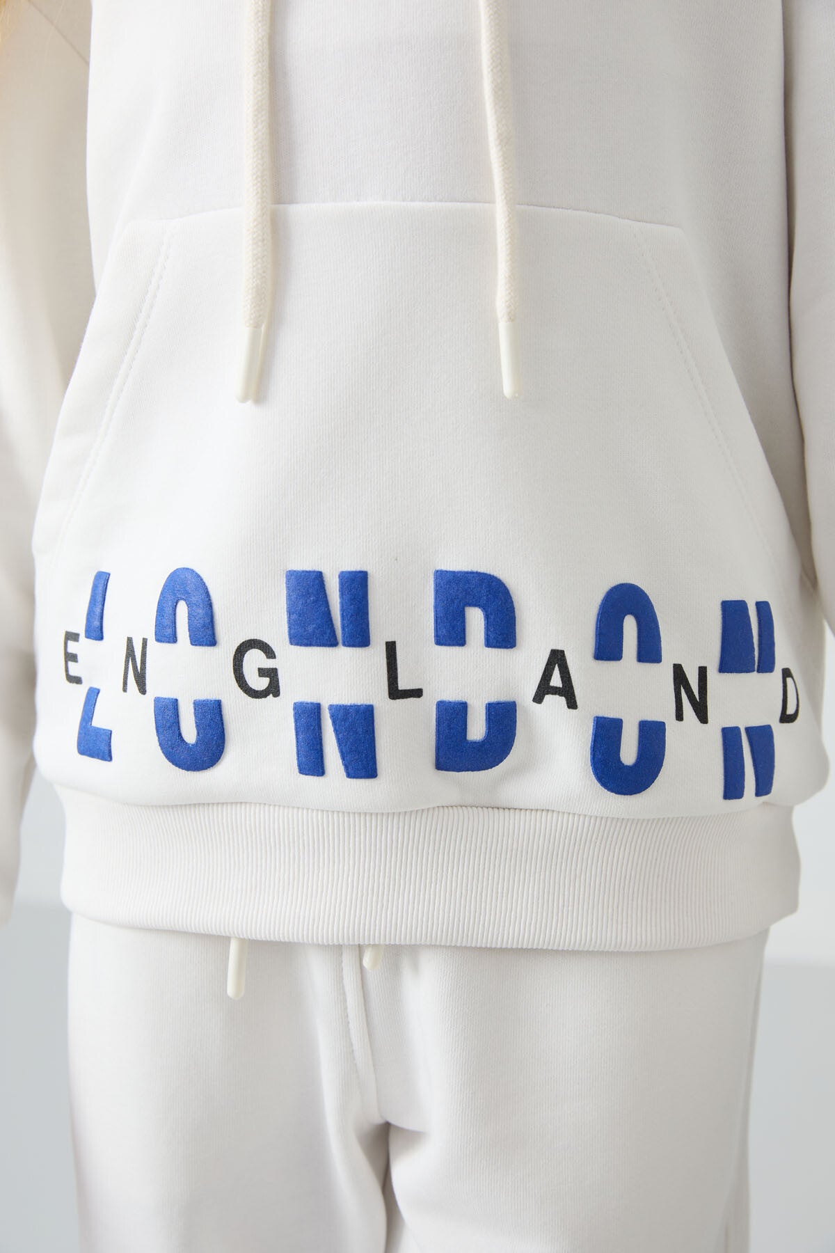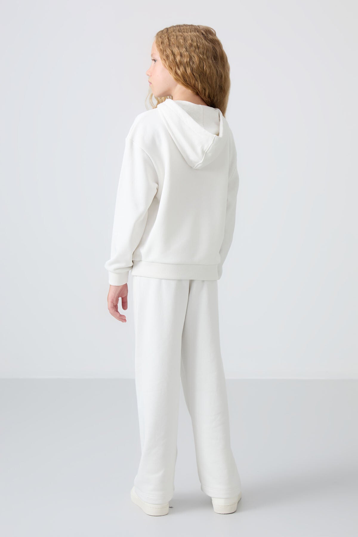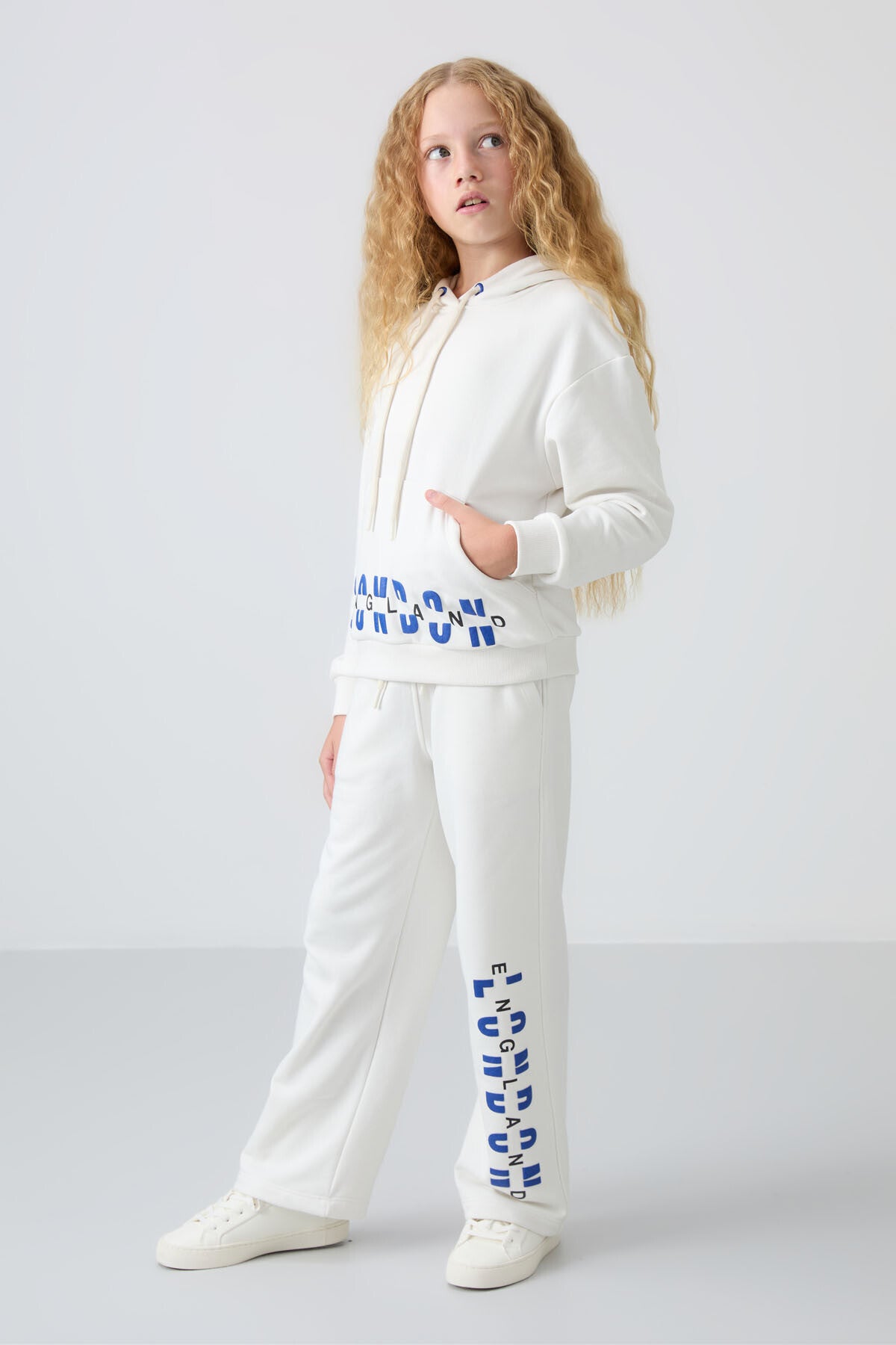 Ecru Cotton Fleece-Lined Soft Textured Oversize Printed Girls' Tracksuit Set - 75147