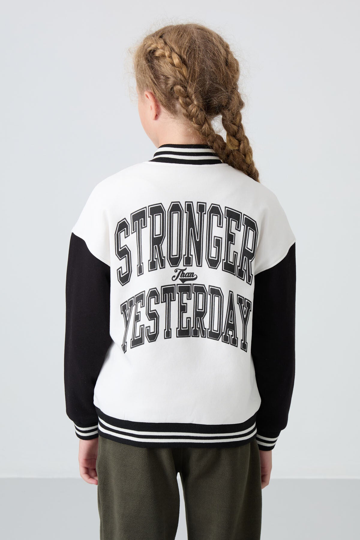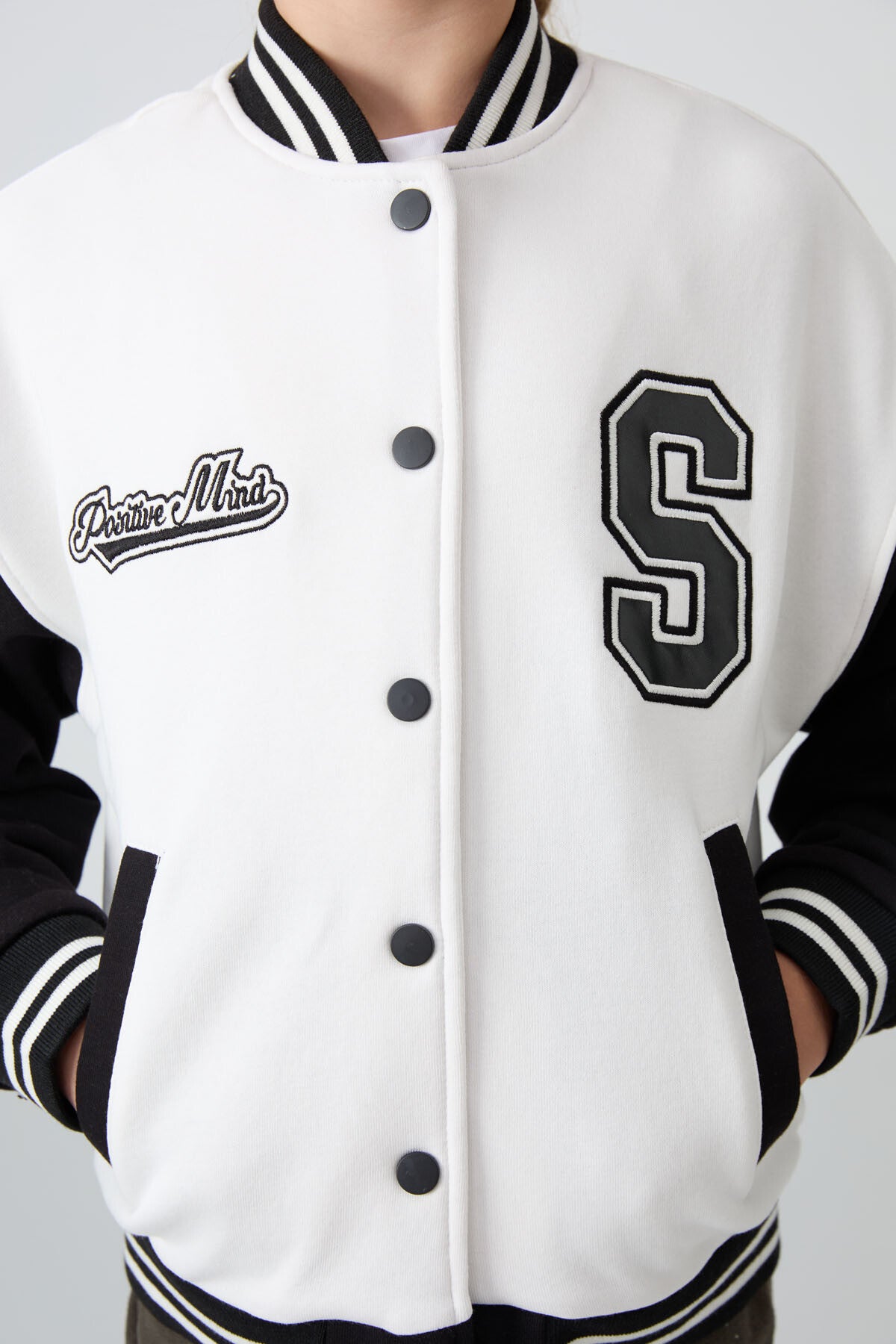 Ecru Cotton Lined Furry Soft Textured Standard Fit Embroidered Girls' College Jacket - 75163