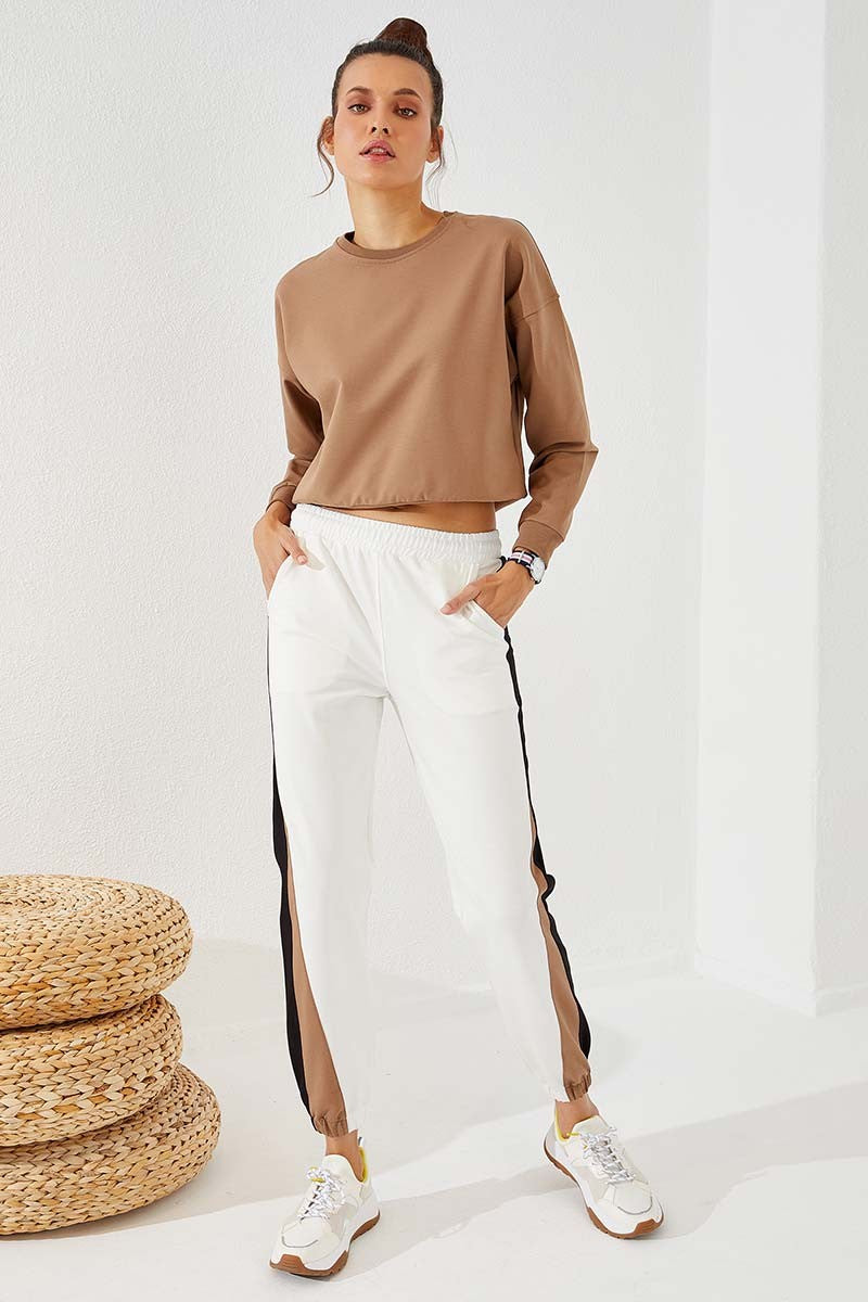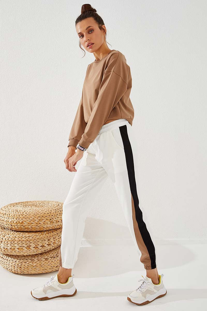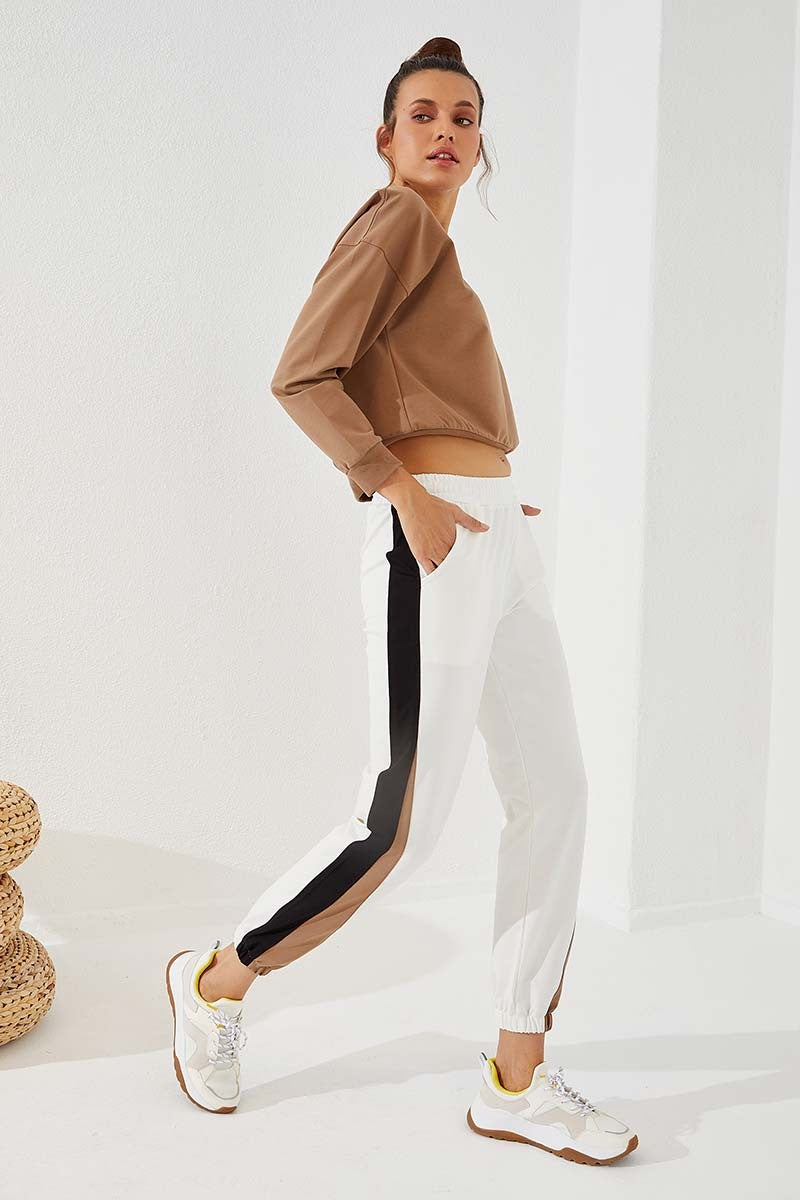 Ecru Two-Tone Striped Comfort Fit Elastic Cuff Women's Tracksuit Bottom - 94582