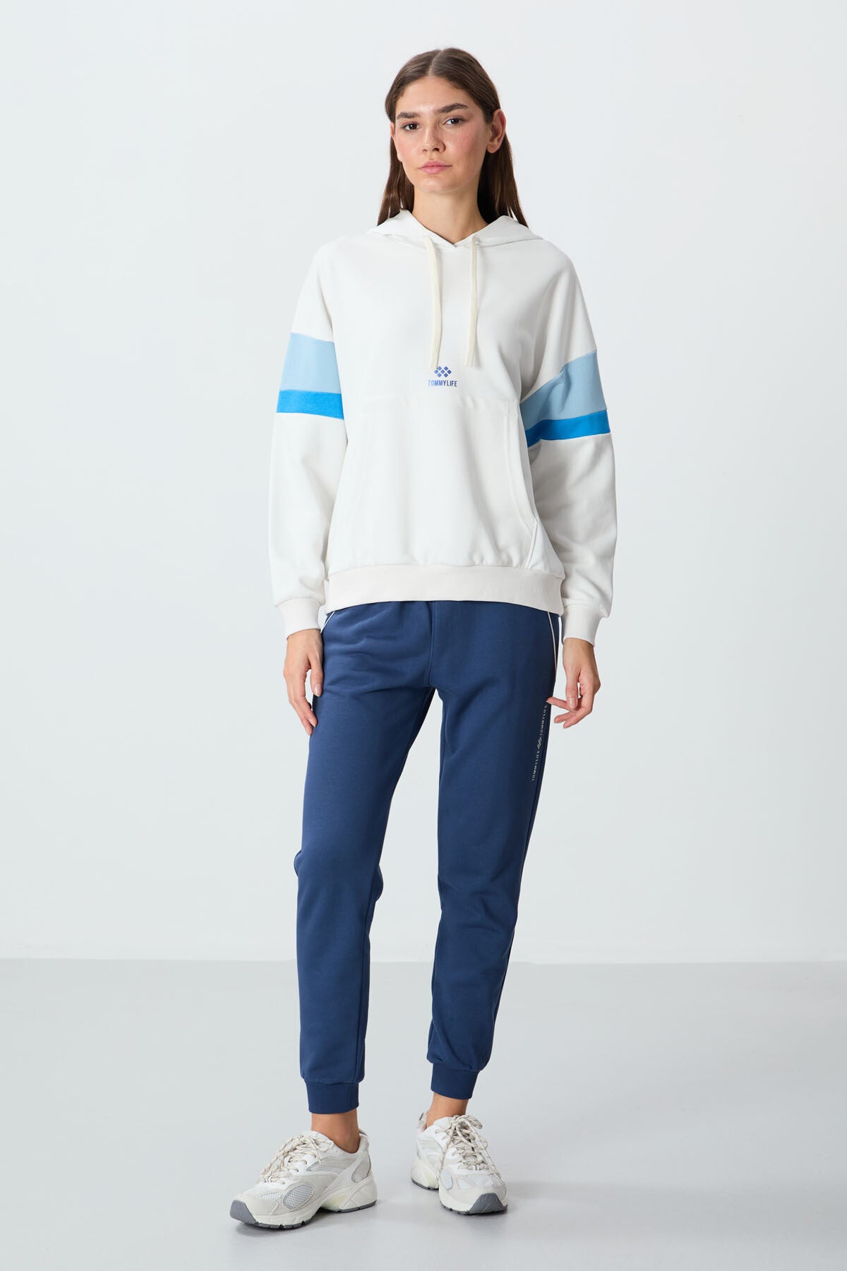 Ecru Compact Cotton Thick Smooth Textured Hooded Oversize Fit Women's Sweatshirt - 97290
