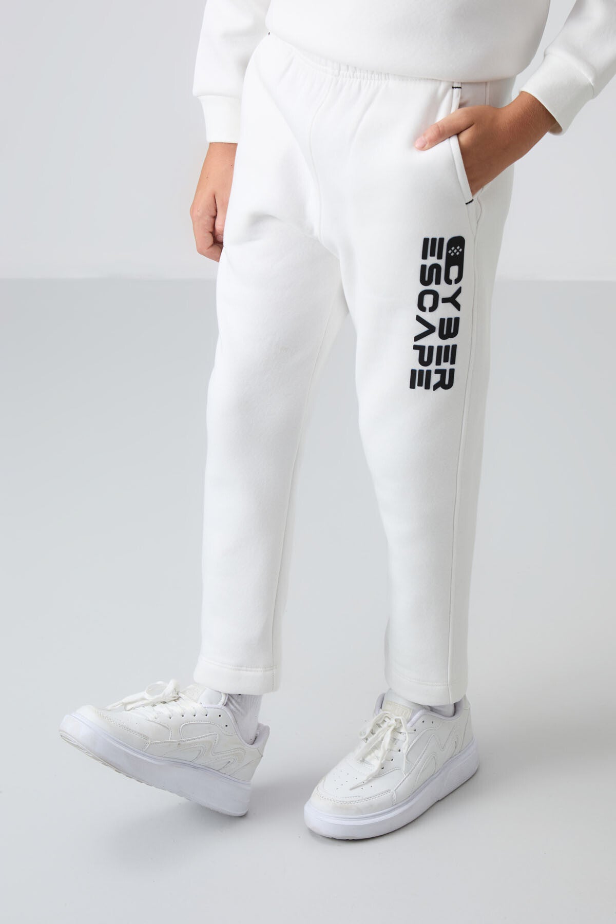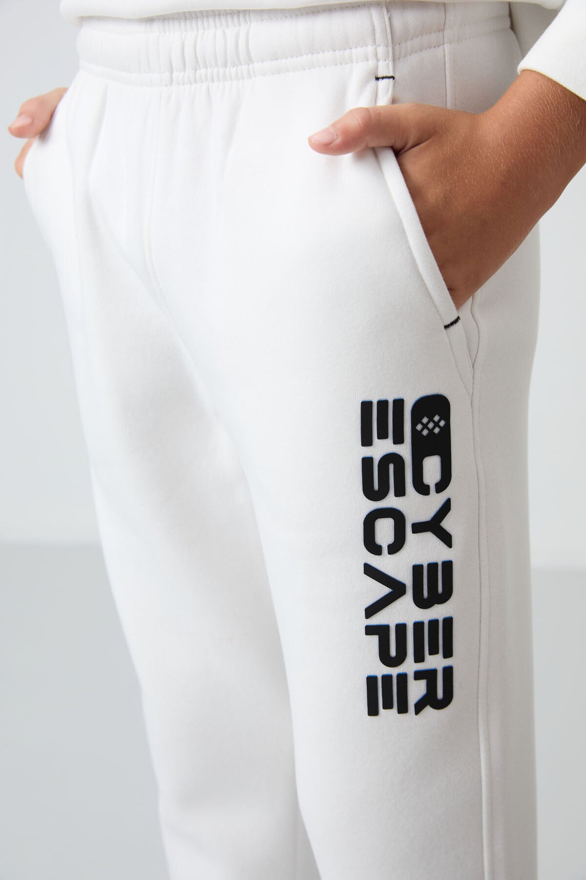 Ecru Cotton Thick Fleece-Lined Soft Textured Standard Fit Printed Boys' Tracksuit Set - 11233