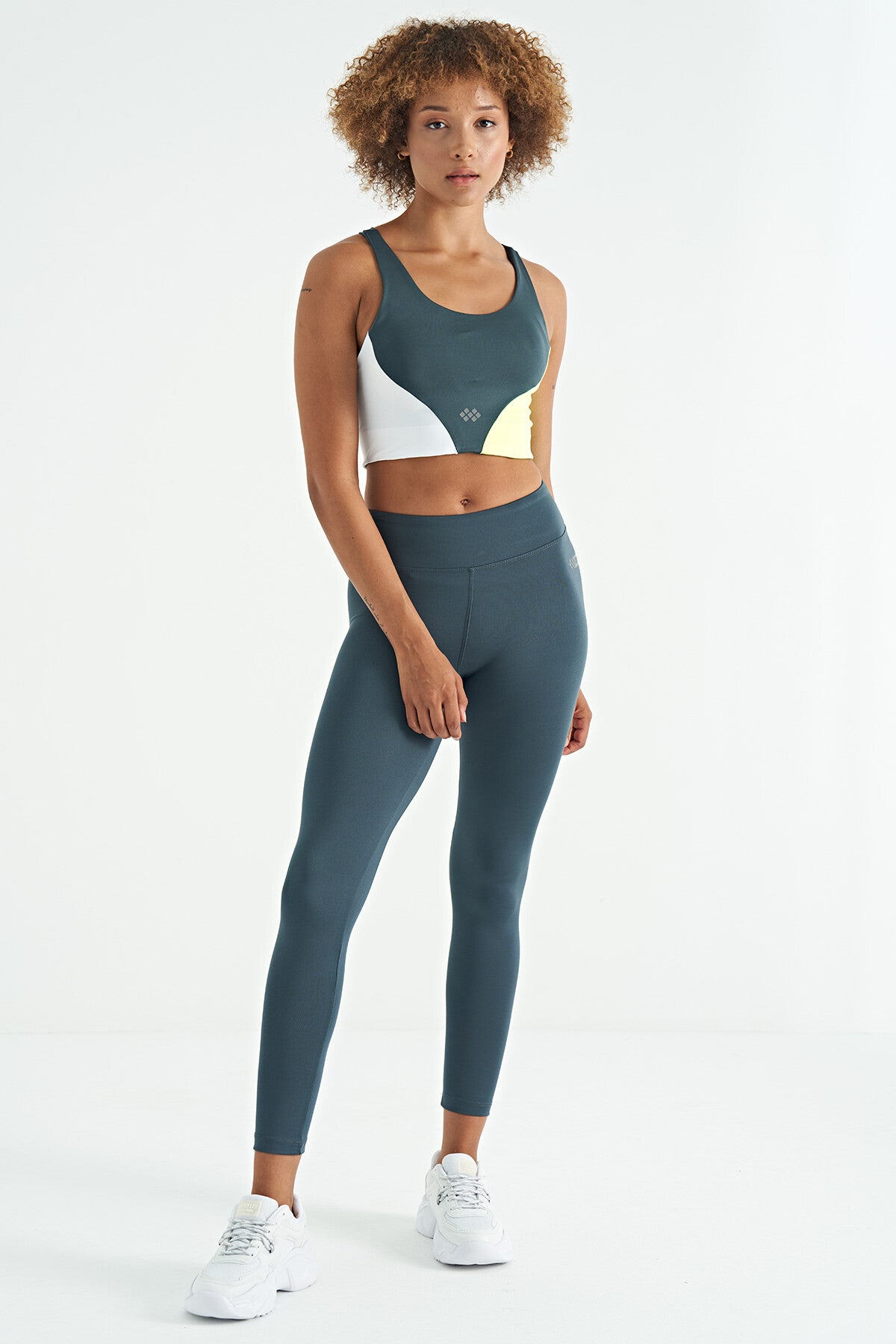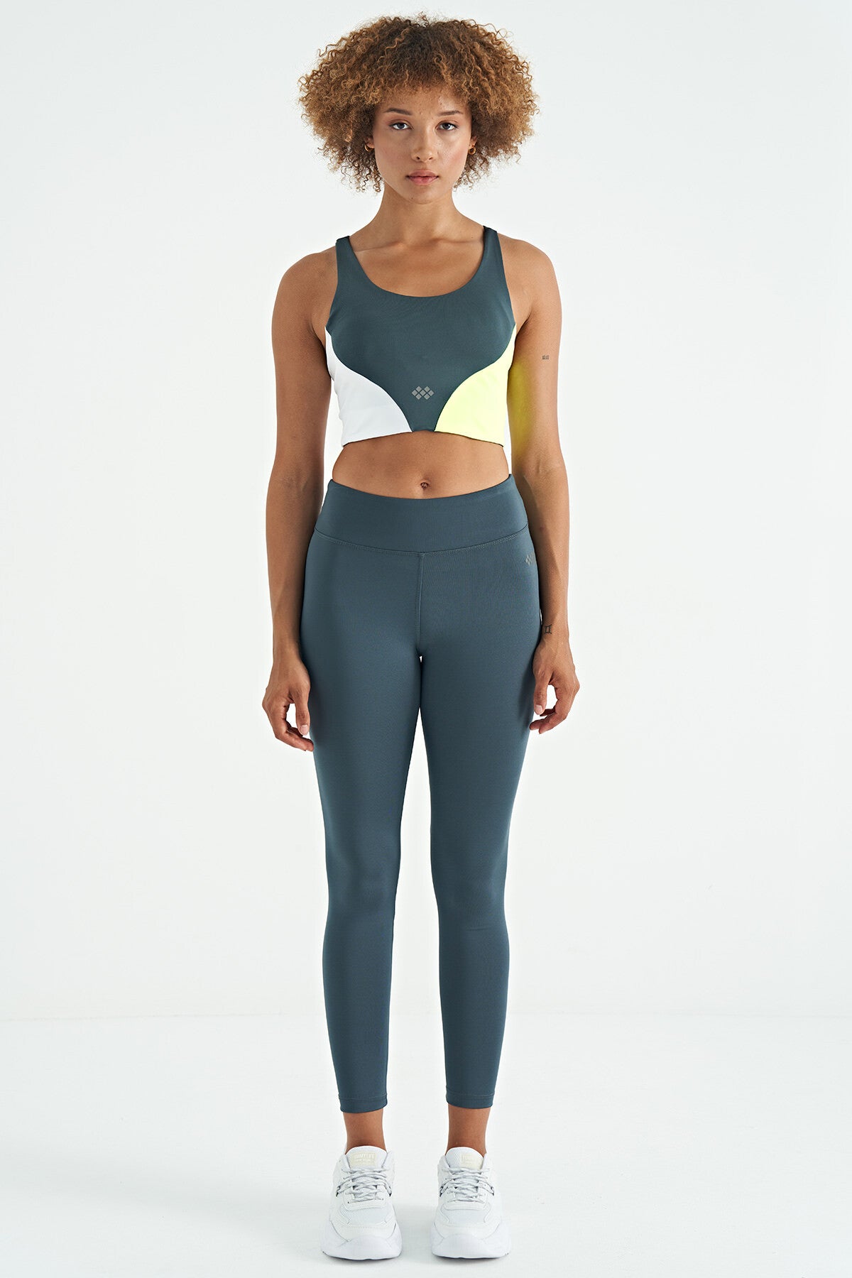 Forest Green Logo Printed Color Block Crossbody Detailed Scuba Fabric Women's Bustier - 97260