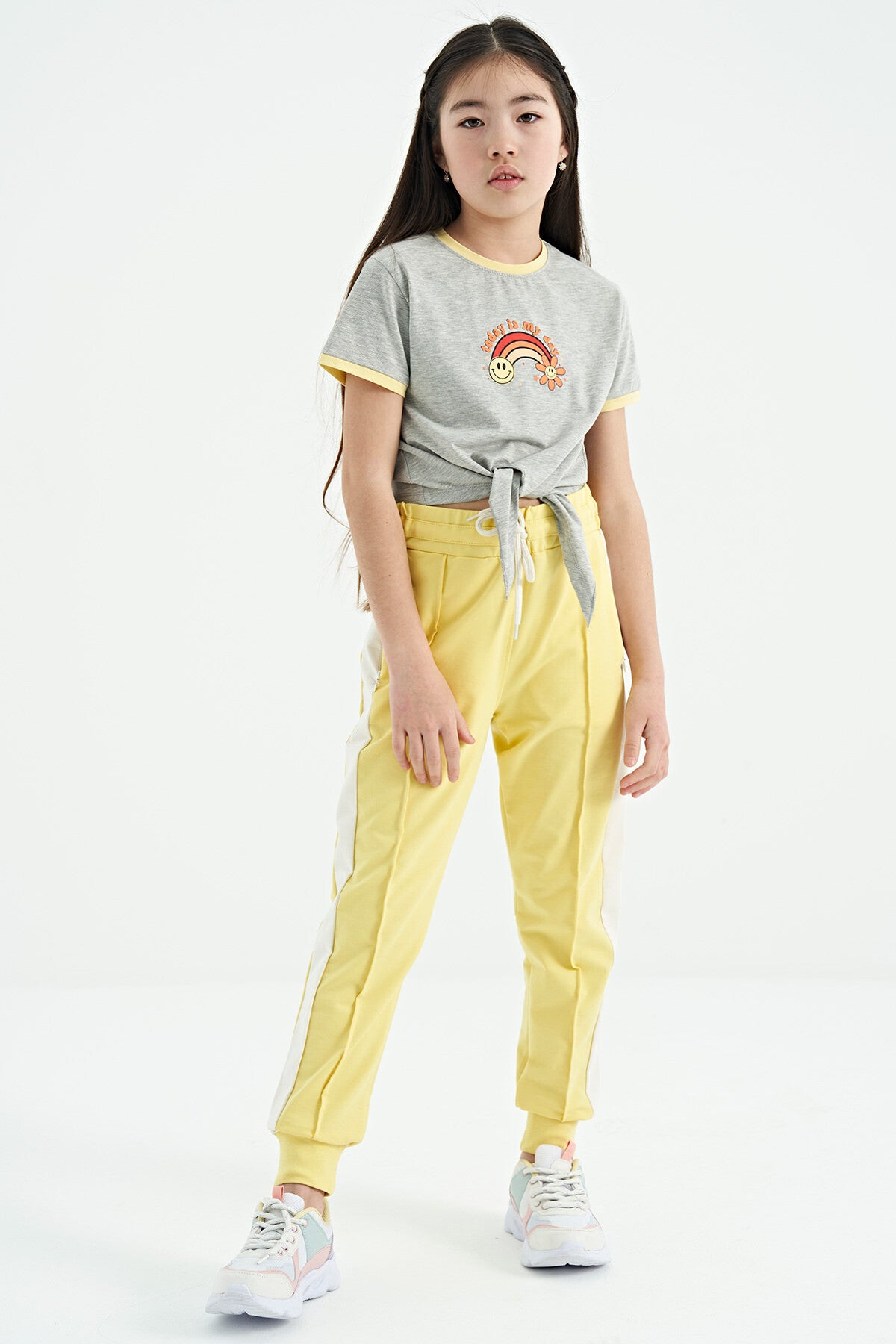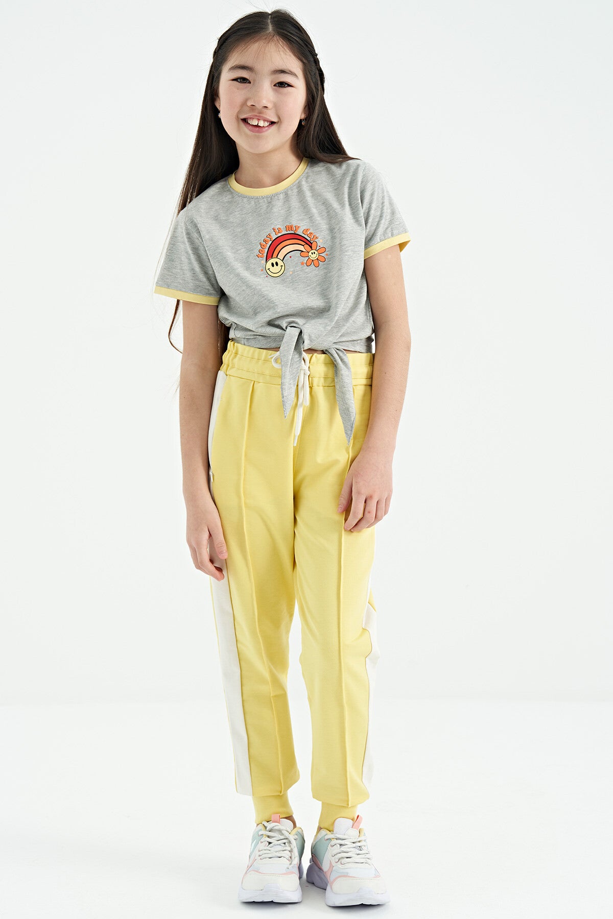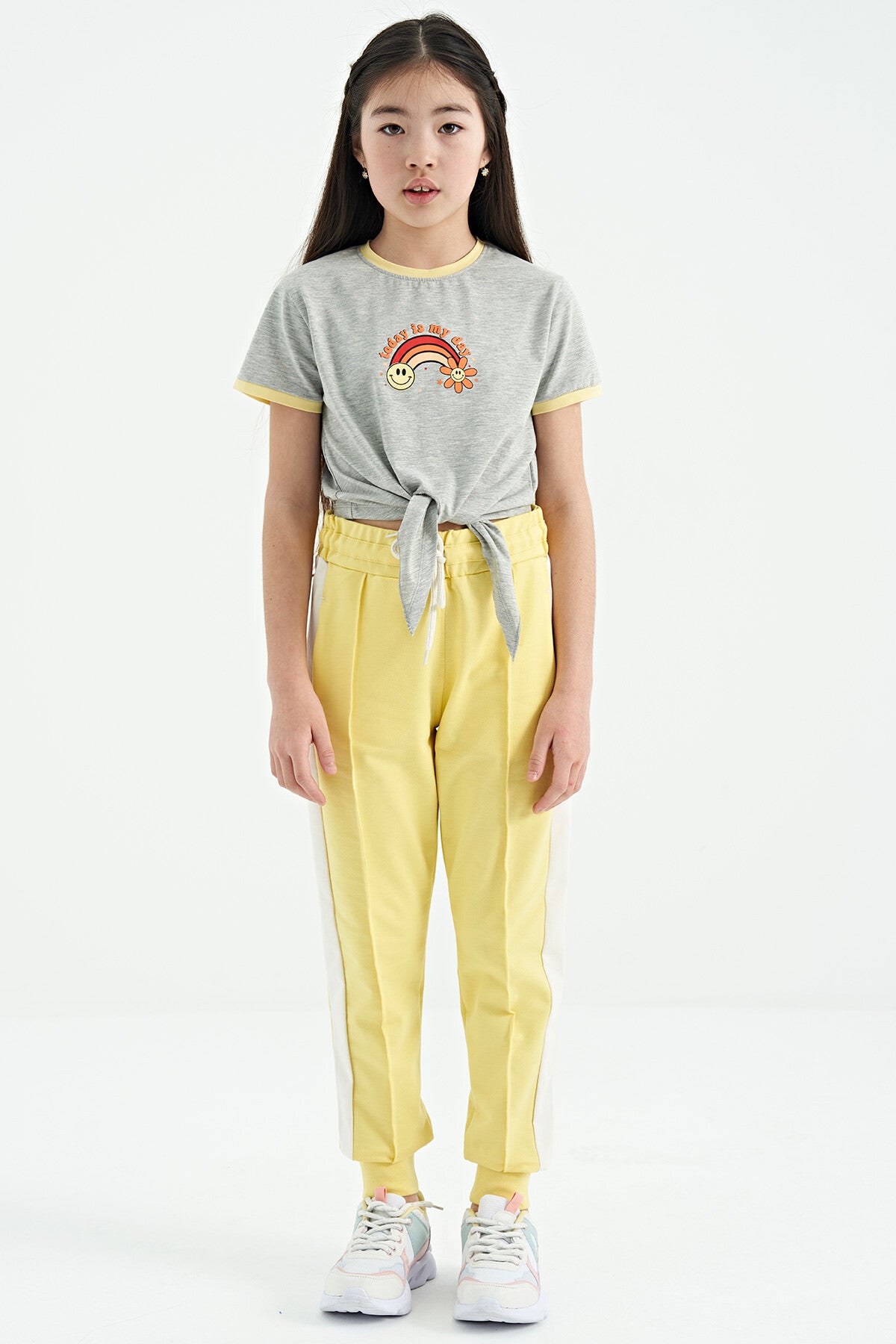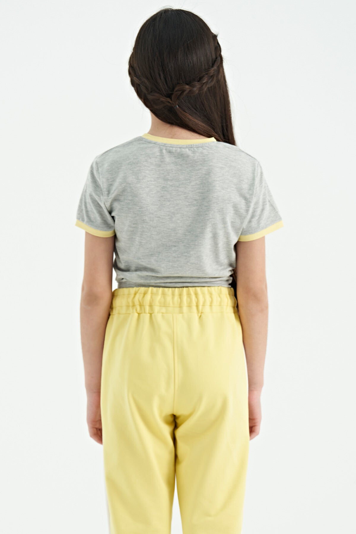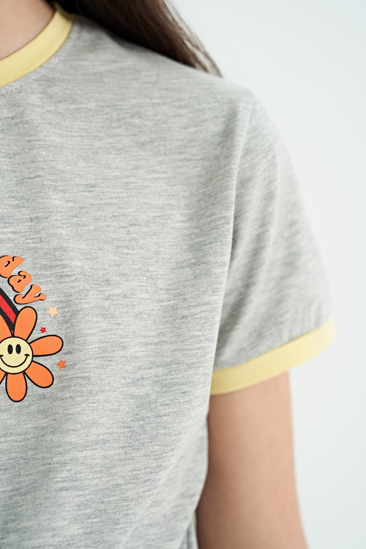 Grey Melange Print Detailed O Neck Multicolor Tie Detailed Girl's T-Shirt - 75113