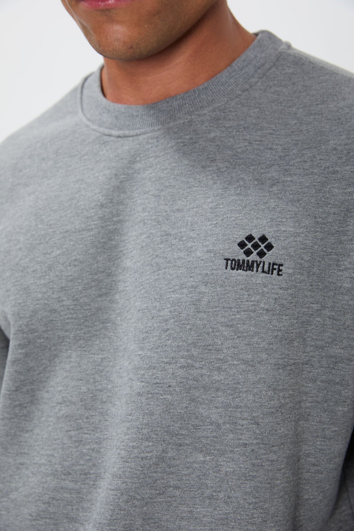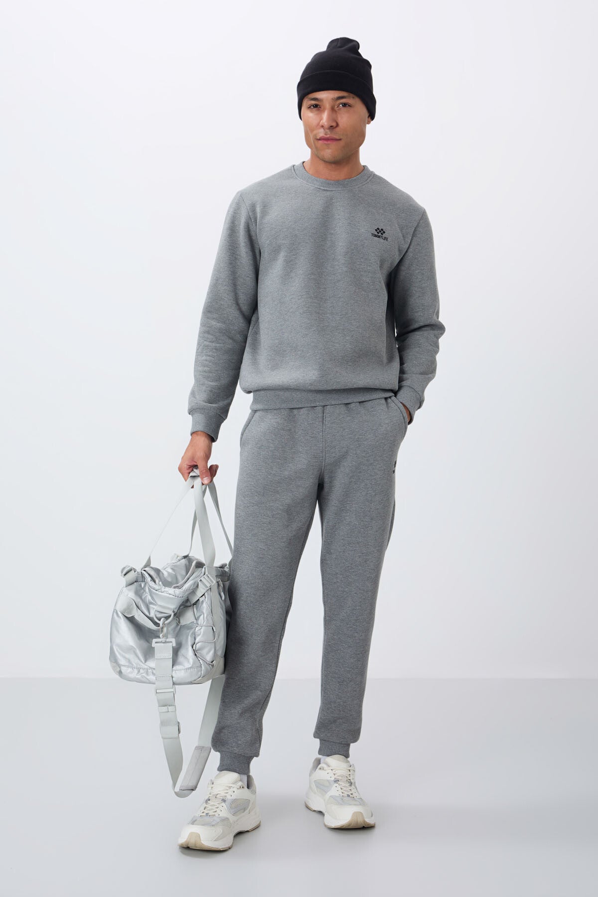 Grey Melange Cotton Thick Fleece-Lined Soft Textured Comfort Fit Embroidered Men's Tracksuit Set -85265