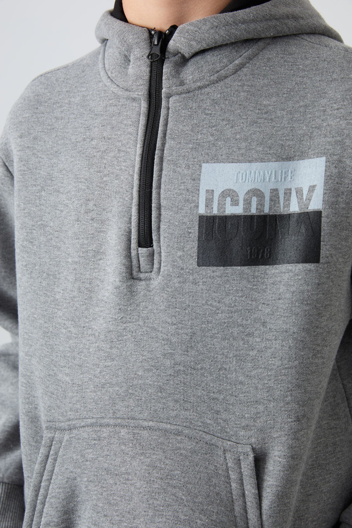 Grey Melange Cotton Thick Fleece-Lined Soft Textured Standard Fit Printed Boys' Tracksuit Set - 11246