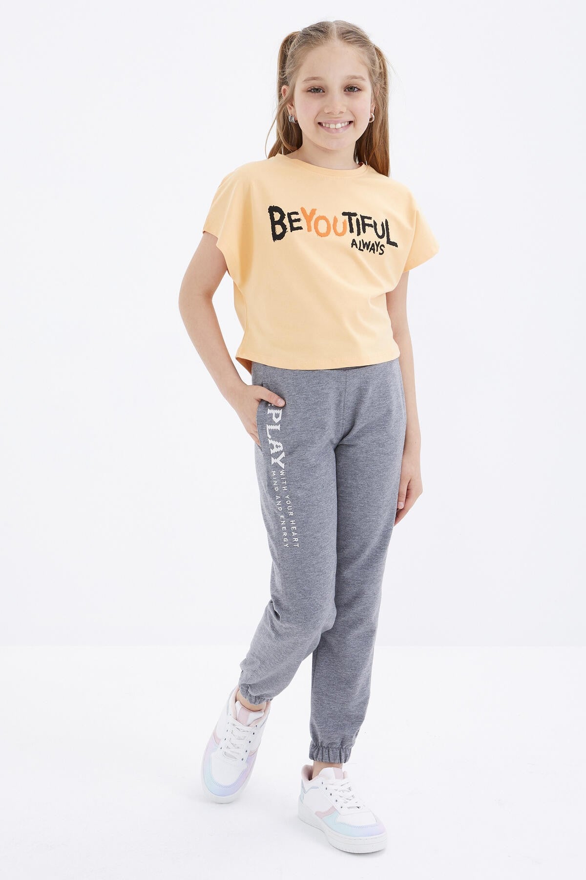 Grey Melange Print Embroidered Laced Standard Fit Elastic Hem Girls' Tracksuit Bottom - 75051