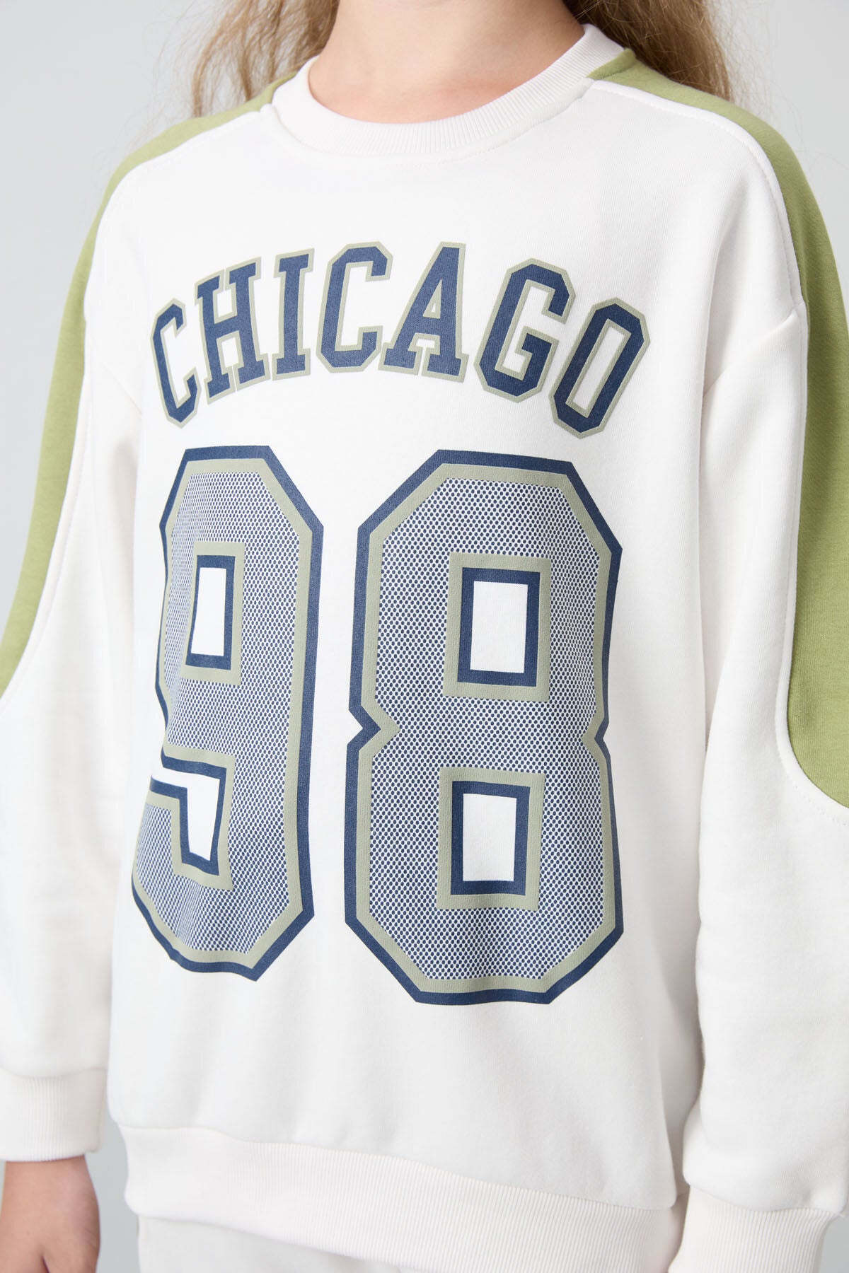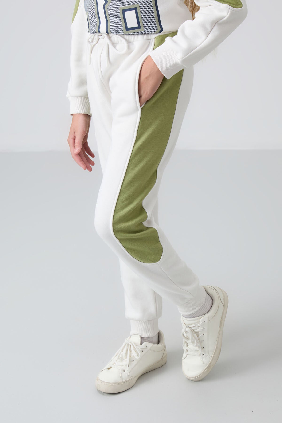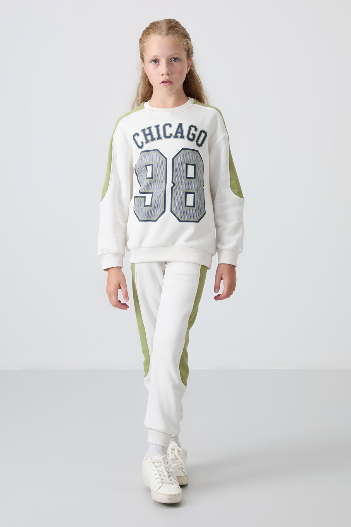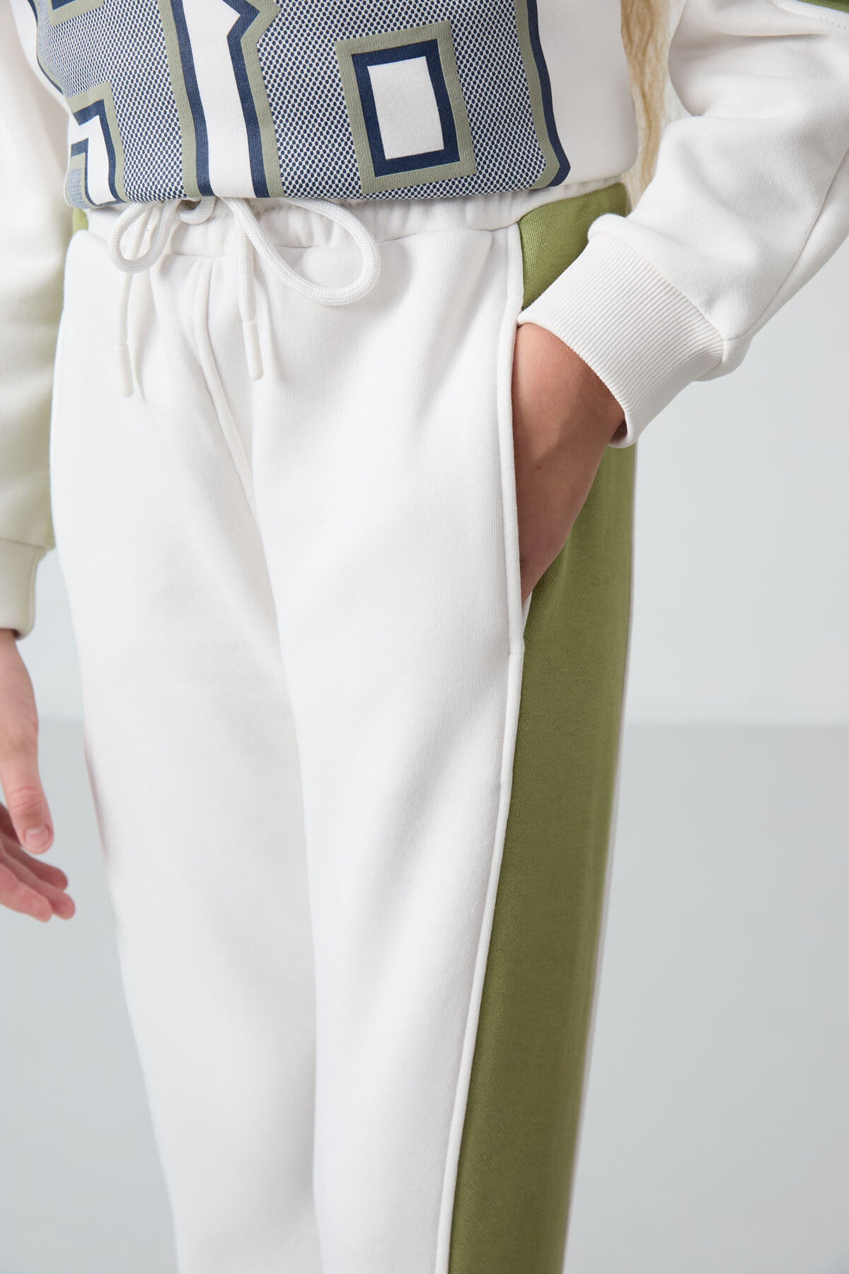 Light Beige Cotton Fleece-Lined Soft Textured Standard Fit Printed Girls' Tracksuit Set - 75170