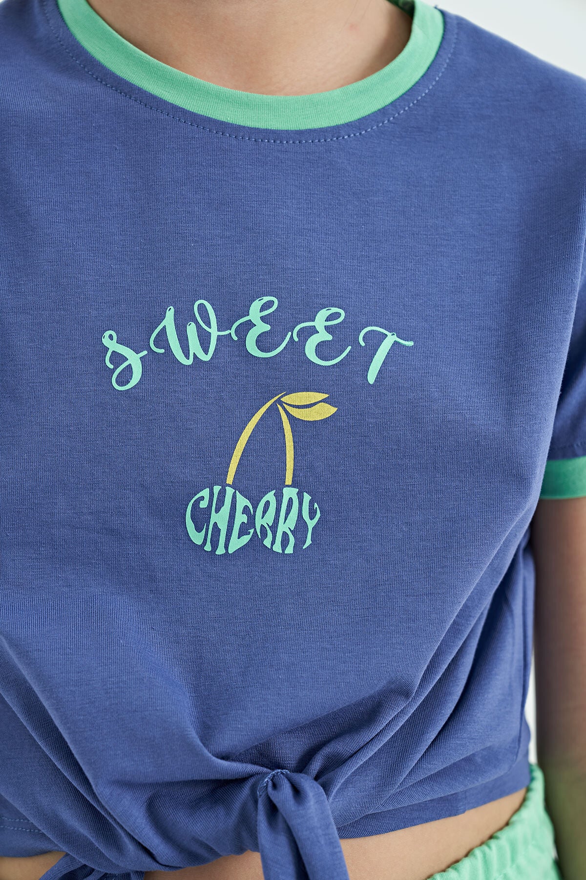 Light Purple - Aqua Green O Collar Printed Knot Detailed Relax Fit Girls' Shorts Set - 75132