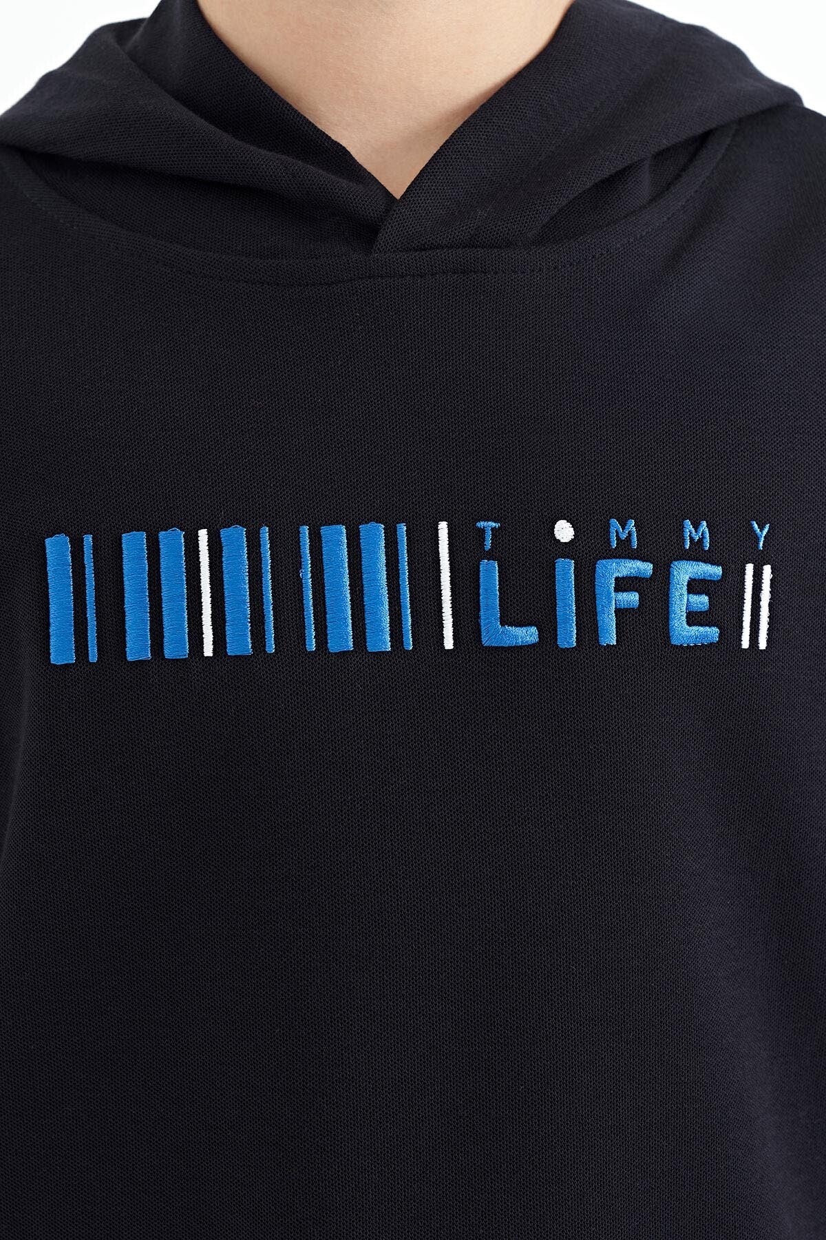 Navy Blue Block Hooded Kangaroo Pocket Oversize Boys T-Shirt - 11148