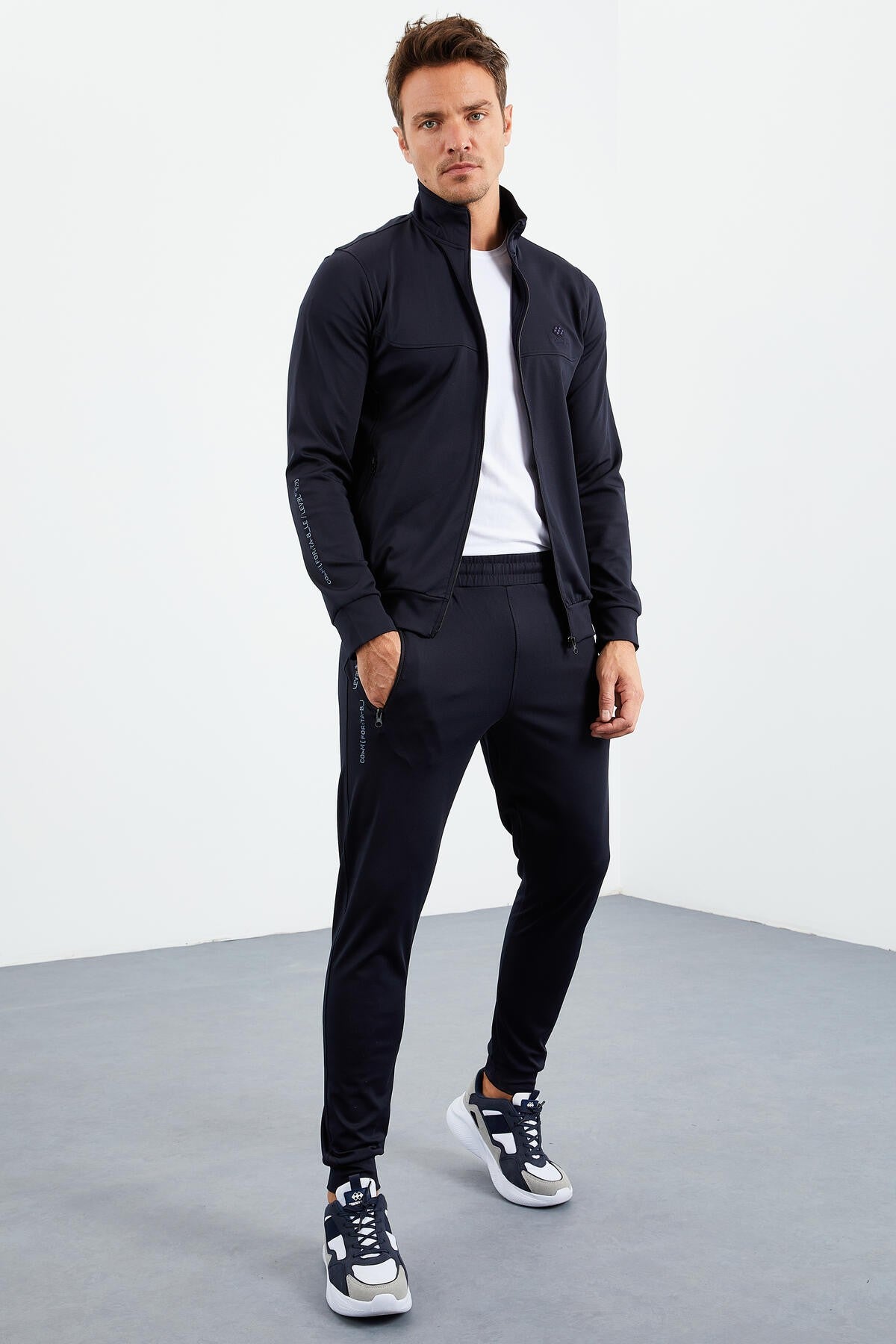 Navy Blue High Neck Zippered Standard Fit Cuffed Men's Tracksuit Set - 85160