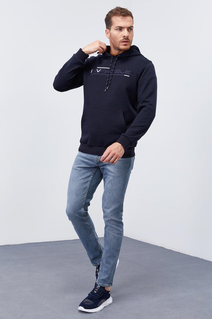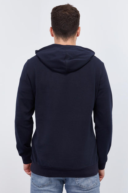 Navy Blue Kangaroo Pocket Standard Fit Men's Hooded Sweatshirt - 87883