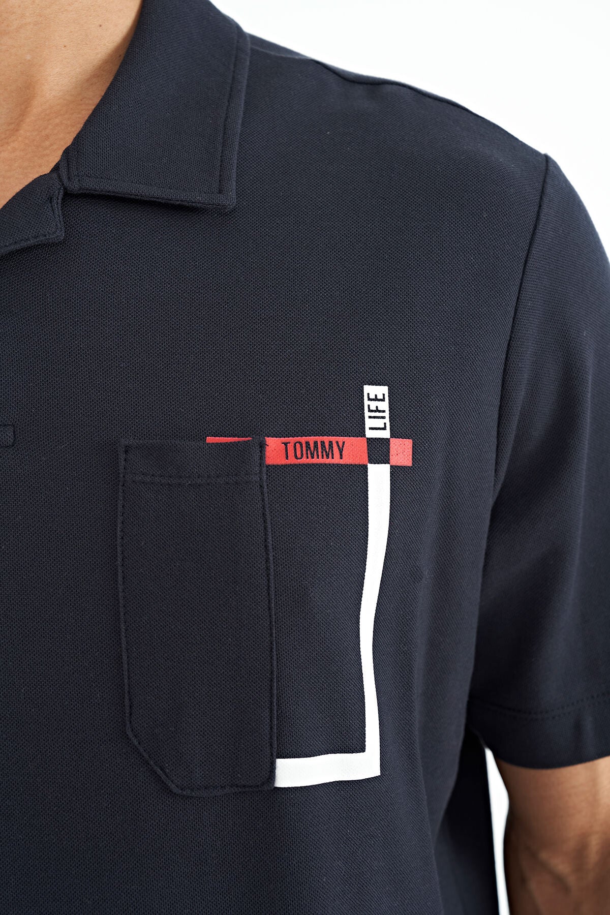 Navy Blue Pocket Detailed Printed Standard Fit Polo Collar Men's T-Shirt - 88241