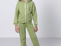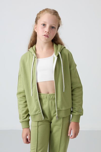 Oil Green Cotton Lined Fleece Soft Textured Standard Fit Embroidered Girls' Tracksuit Set - 75161