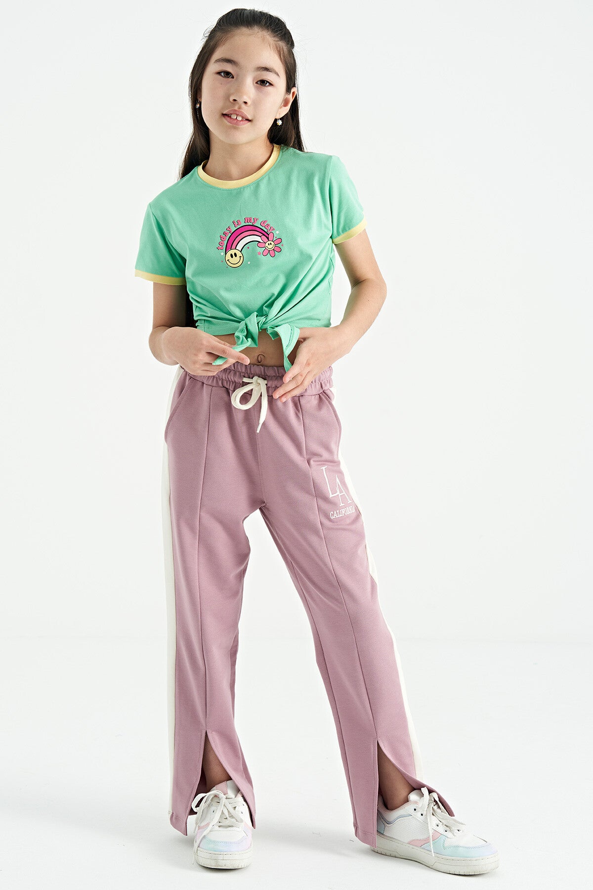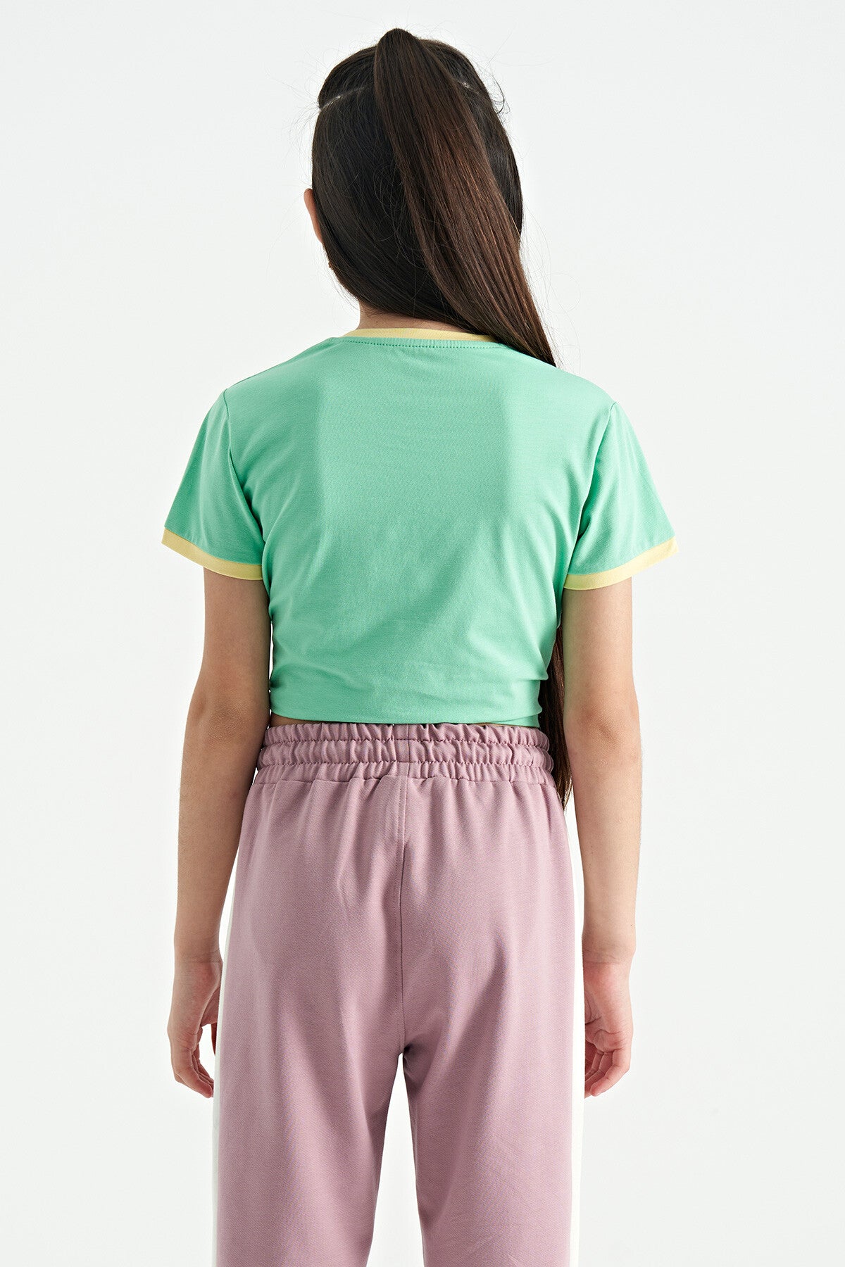 Olive Green Print Detailed O Neck Multi-Colored Tie Detailed Girl's T-Shirt - 75113