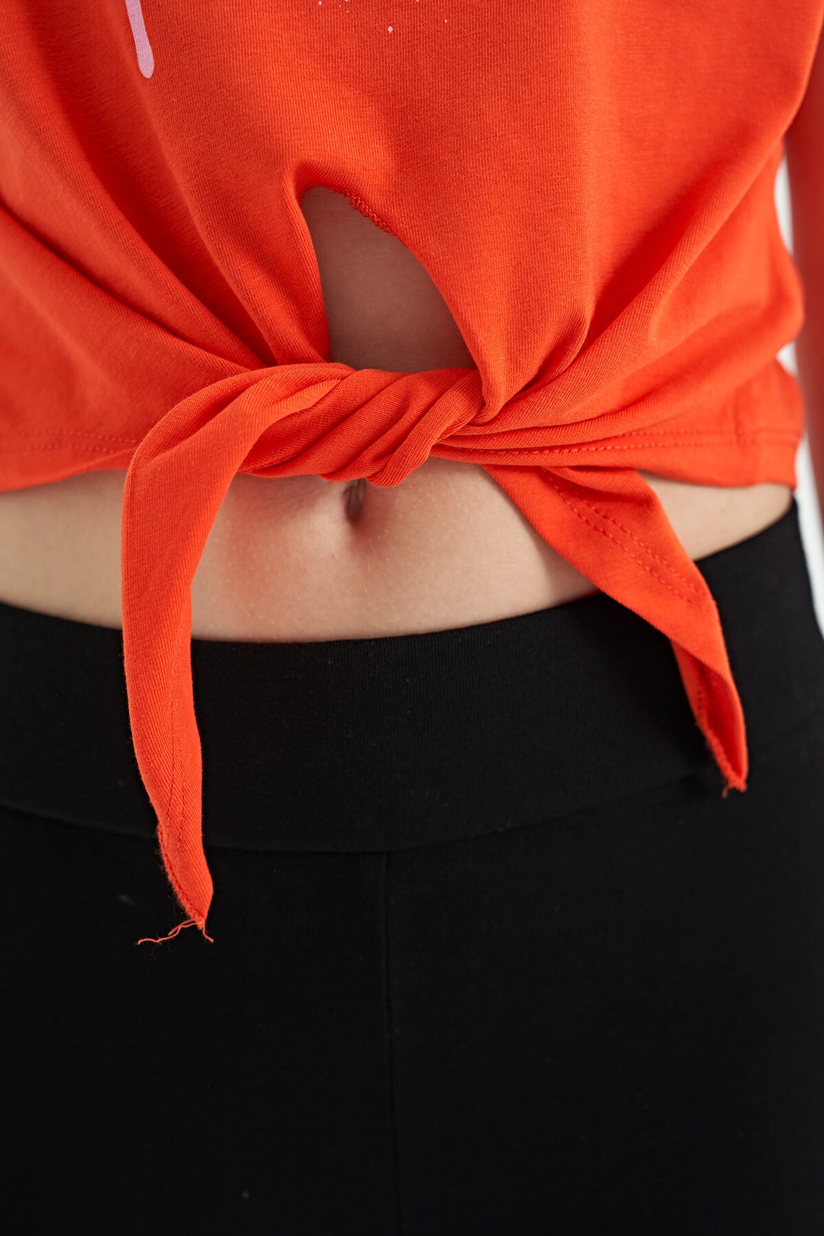 Orange Heart Print Front Knot Detailed Comfortable Fit Girls T-Shirt - 75114