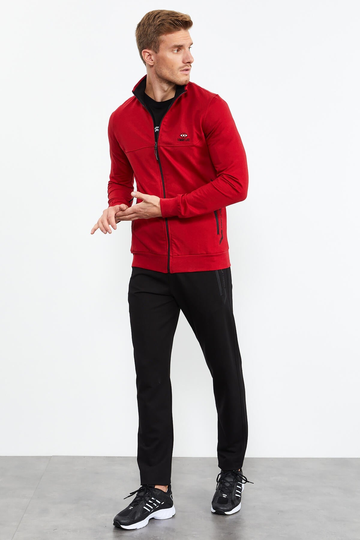 Red - Black Stand-Up Collar Zippered Standard Fit Classic Cuff Men's Tracksuit Set - 85152