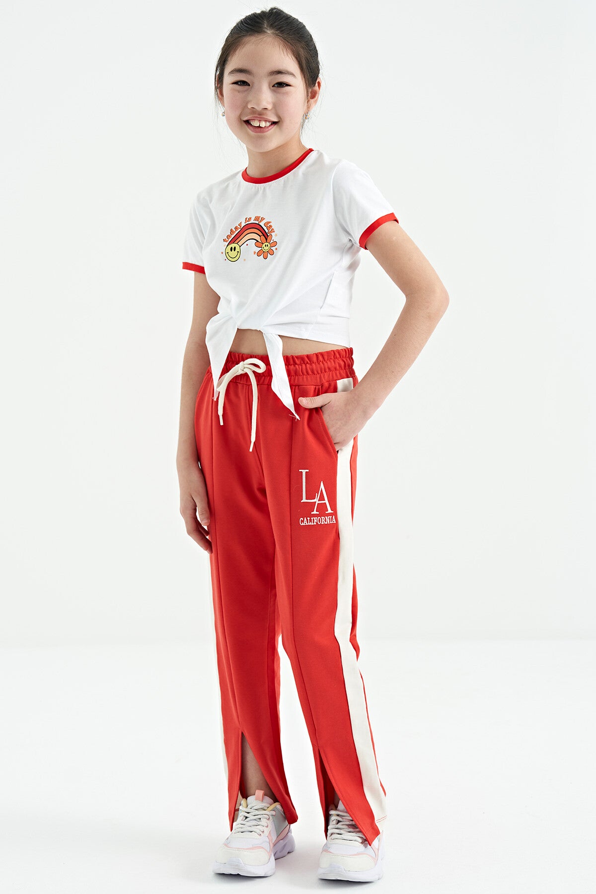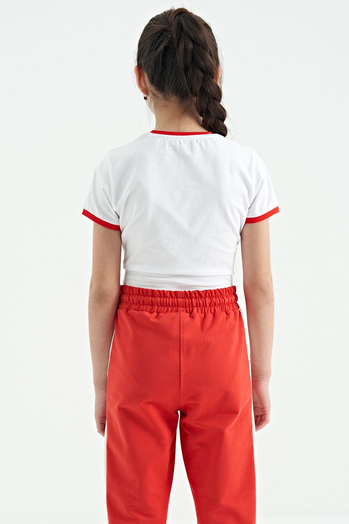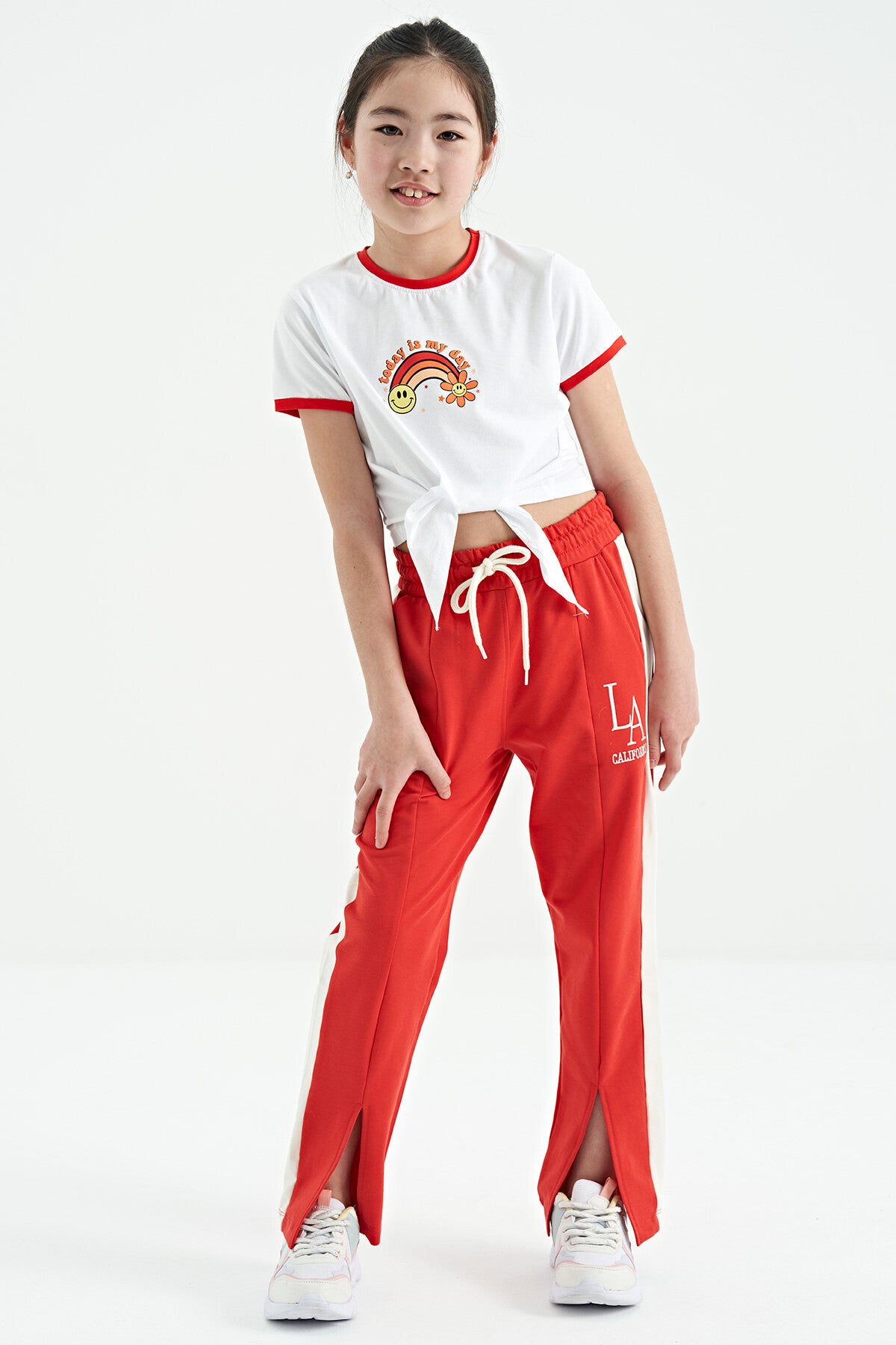 White Print Detailed O Collar Multi-Colored Tie Detailed Girl's T-Shirt - 75113