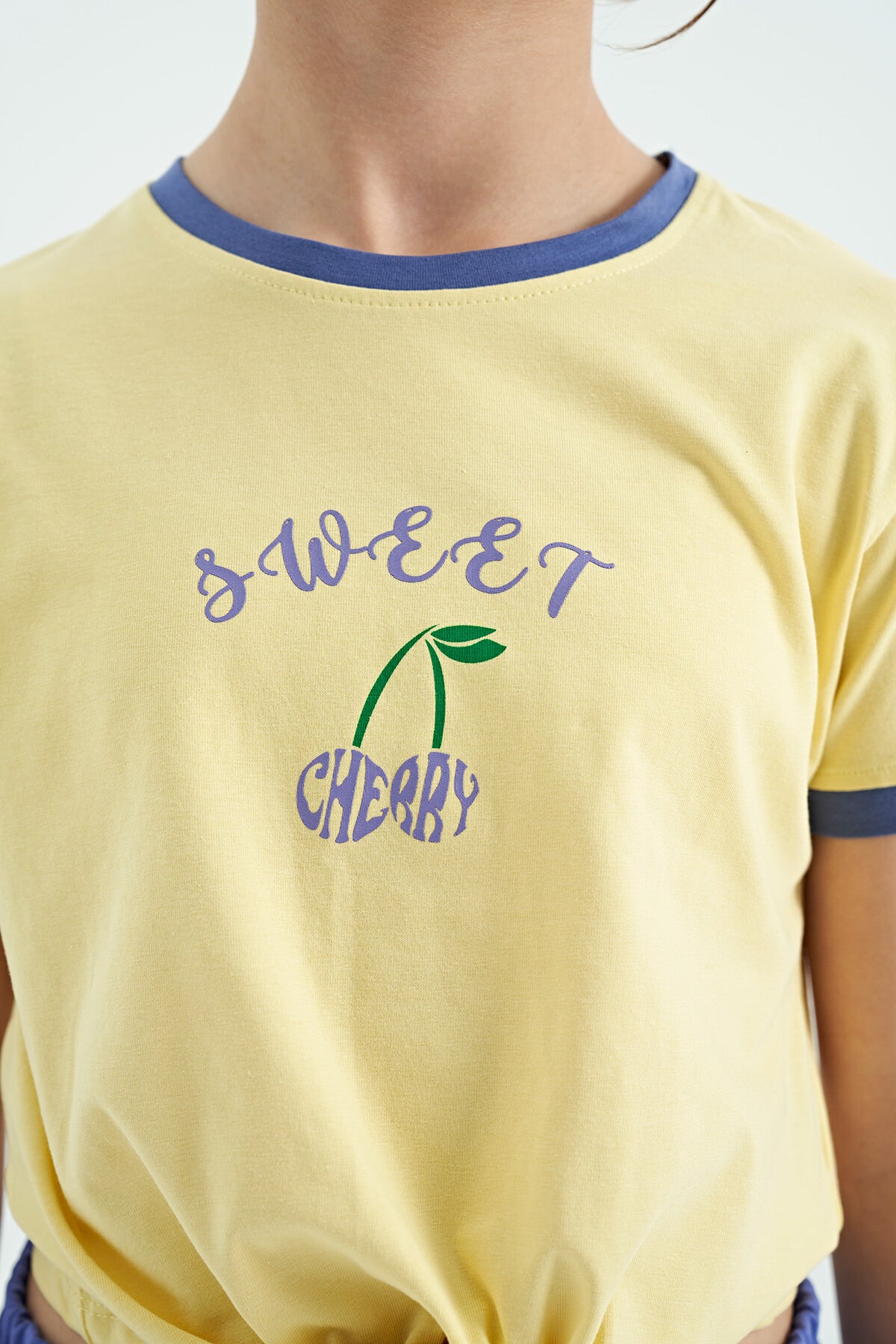 Yellow - Light Lavender O Collar Printed Knot Detailed Relax Fit Girl's Shorts Set - 75132